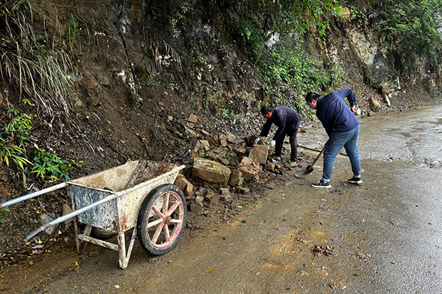 “通村道路出现多处山体滑坡,村委会正在组织清理淤泥和石块,确保第一时间疏通道路,保障村民出行安全。”遵义卷烟厂驻村干部蹇师宇介绍当前防汛抢险救援工作情况。近日,遵义市正安县瑞溪镇团结村遭遇大风、冰雹、强降雨等极端天气,蹇师宇快速反应,全力投入到防汛抢险救援工作中,切实守护村民生命财产安全。