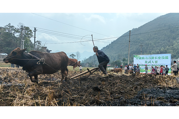 随着裁判员一声哨响,耕地比赛的选手们挥起手中的鞭子,驱赶着大黄牛开始耕地,1人1牛合作起来十分默契,不到一会儿的工夫,画好的比赛区域便全部完成了翻土作业。而在另外一片区域进行的玉米种植比赛,选手们也沿着画好的线展开比拼,打窝、放粪、播种、盖土一气呵成,比的既是速度也是精度。周围围观的村民们看着选手们你争我赶,纷纷为认识的好友、亲人加油打气。