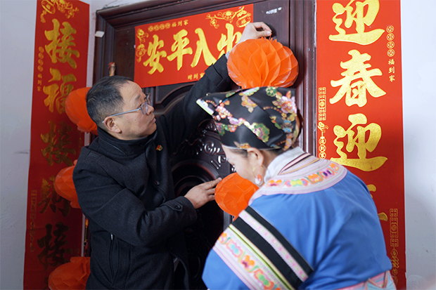 驻长流村第一书记杨晗带领工作队开展“寒冬暖心,干群同行”慰问活动,走访48户困难群众,送慰问物资、贴春联、排查安全隐患,一张张便民服务卡让群众倍感温暖。残疾人刘凡聪望着红彤彤的春联,腼腆微笑;监测户刘粘妹抚平春联,畅想着年后养牛增收的前景。